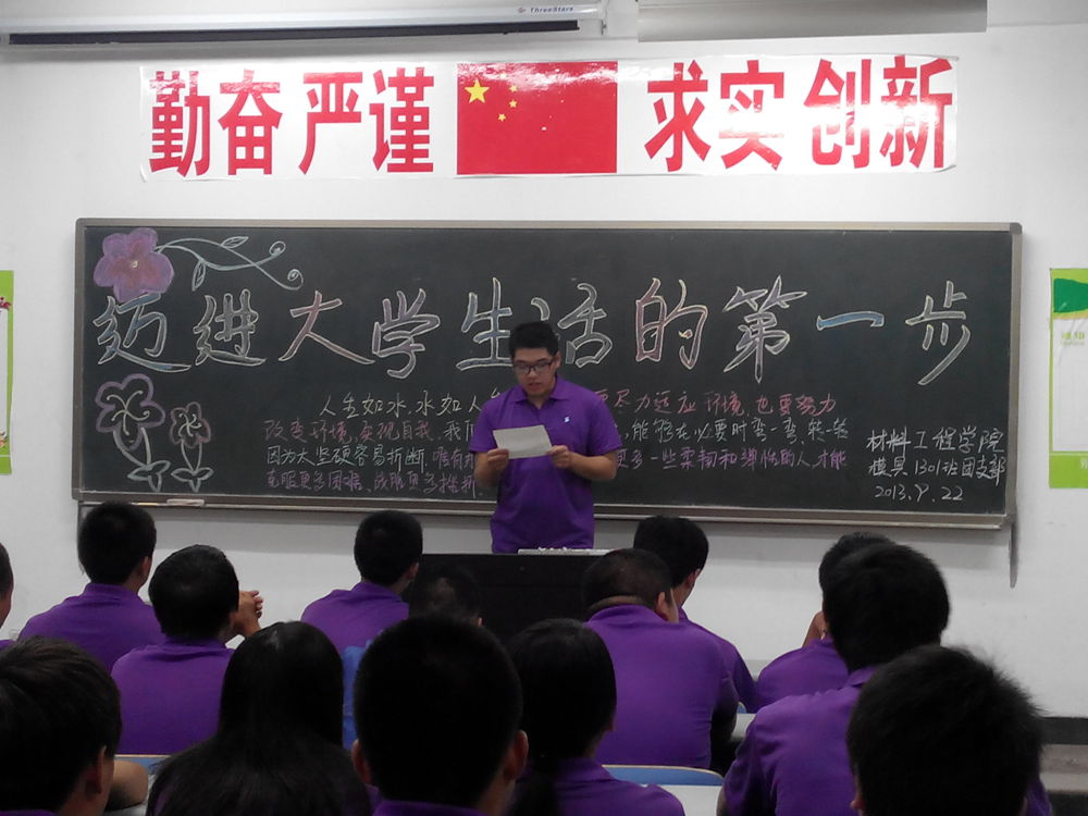 为使大一新生能更好更快的适应大学的生活,在2013年9月22日晚自习期间,材料工程学院大一新生举办了以“如何迈进大学生活的第一步”为主题的主题班会。