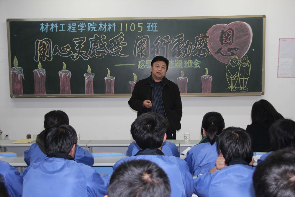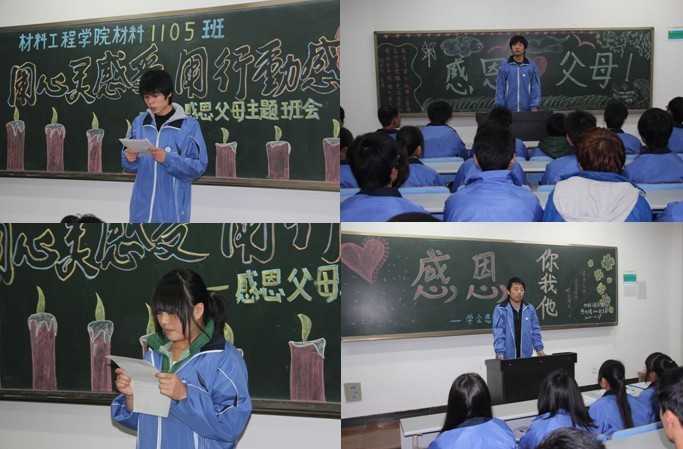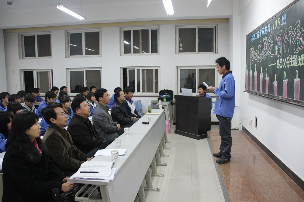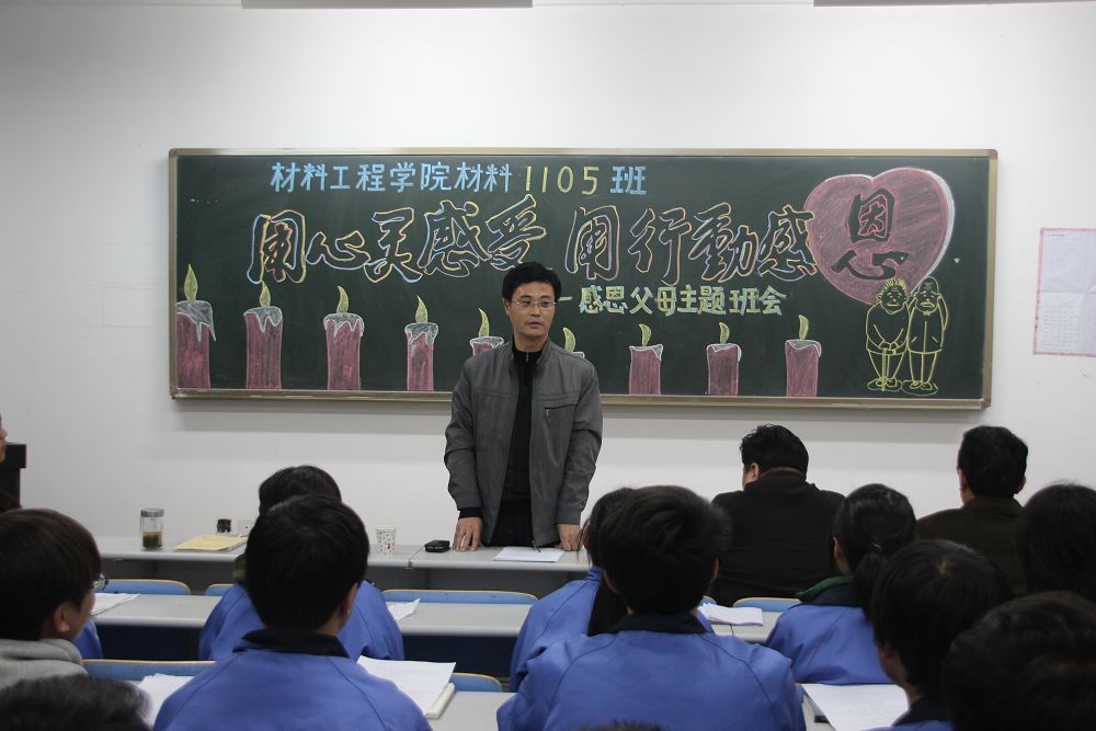 院学生工作部部长、学生处处长王超联、学生教育管理科科长王康虎、材料学院党总支书记罗怀晓、学工办主任郭旭华应邀来到材料1105班参加班会。同学们穿戴着整齐的校服,严格遵守会场秩序,该班此次班会形式多样,内容精彩纷呈,不落窠臼,李元兆同学的父母以现场录音的方式说出了对孩子的一片真情和希望;李凯瑞同学写给父亲的一封信同样感人肺腑,同学们都侧耳聆听,听着听着,感动的泪水不由的沾满了衣衫,擦湿了纸巾,老师和同学们被这感人演讲所征服,所震撼!同学们在这次活动中说出了对父母、老师、同学、朋友的感恩之情,场面温馨无比,也让全体同学在泪水中接受了心灵的洗礼。