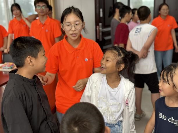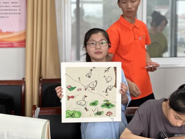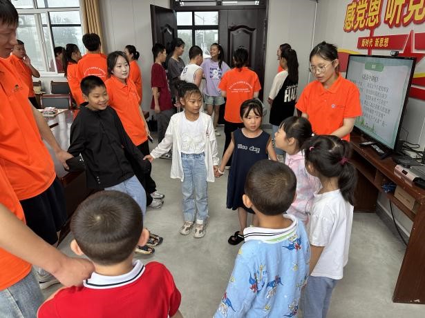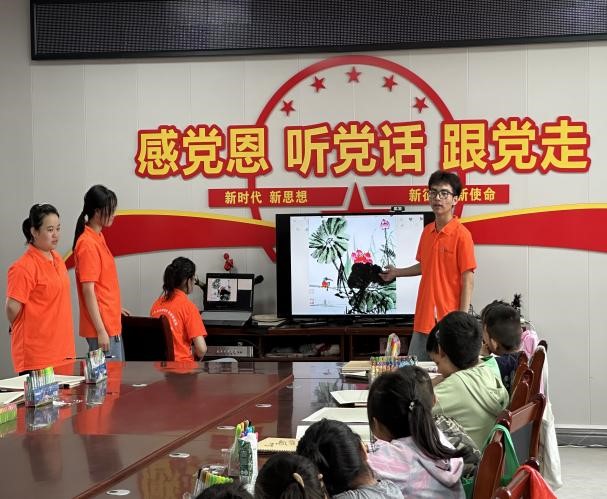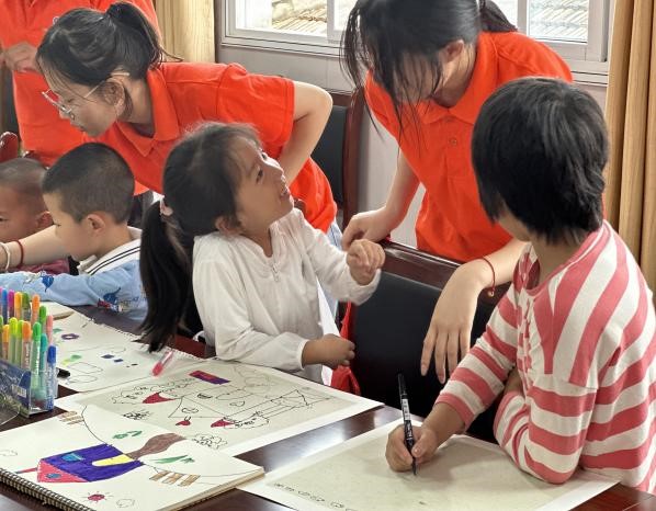 课前,为了和小朋友们迅速熟络起来,实践队员们准备了有趣的“数字抱团”破冰小游戏。现场气氛活跃,笑声不断,大家尽情的享受在游戏中。游戏间的团队合作让小朋友们加深彼此间的关系,结成朋友,也拉近了实践队员和小朋友们心的距离。游戏结束后,实践队员开启了今天的绘画课。他们从绘画的分类,框架线条、以及色彩的填充等艺术语言,带领乡村儿童利用构图、造型、设色等艺术手段进行创作。