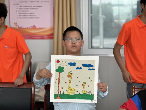 “哥哥,我画的怎么样?”一个小女孩抬着天真可爱的小脸蛋说着。孩子们神情专注地投入创作,脸上始终挂着愉快的微笑,还时不时回过头来问身边的大哥哥大姐姐如何处理一些构图和色彩生的小细节。不一会儿,一幅幅充满创造力的画跃然纸上。