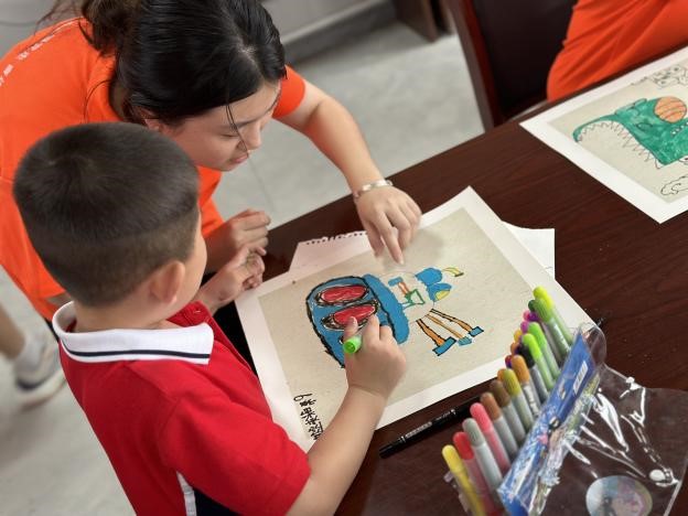 “姐姐我要画霸王龙”“哥哥我要画变形金刚”“我想画皮卡丘”“我要画城堡”......小朋友毫不怯场,一个个争着想要大哥哥大姐姐们教他们画画,把他们的想法在纸上呈现出来。队员们耐心倾听每一个小朋友的想法,充分运用专业知识,与小朋友们分享绘画技巧和思考方式。在队员们的指导与协助下,小朋友们纷纷打开创意之门,体验绘画给他们带来的快乐。