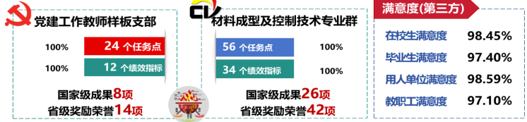 建成了统筹专业发展各领域、教育教学各环节、人才培养各方面育人资源的“熔炉型”教师党支部,先后取得省级以上成果及荣誉22项。引领了材料工程学院全面高质量完成了“双高计划”材料成型及控制技术专业群建设任务,先后取得引领职业教育改革发展和人才培养的重大成果3项,支撑国家战略和陕西制造强省战略发展的建设成果11项,支撑专业高质量发展的国家、行业标准类成果12项。创建任务完成情况见图1。
