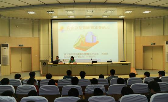 2015年10月12日,材料工程学院优秀校友,模具设计与制造专业2002届毕业生郭康康做客“校友大讲堂”,做了题为“职业生涯规划与选择”的专题报告。讲座由就业指导处主办、材料工程学院承办,材料工程学院党总支副书记郭旭华主持,学生工作办公室主任郝平、辅导员吕宏,部分专业课老师及材料学院400余名师生在学术会堂聆听了报告。