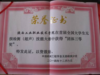 12月5日至10日,2014全国首届高等院校超声无损检测技能大赛在山东举行。本次大赛项目为钢板对接焊缝超声检测,分理论比赛及实际操作两部分。来自全国13个省份的19所高等院校的代表队参赛,我院检测专业学生徐飞、杨艳红和袁丹阳组成的代表队荣获“超声无损检测”三等奖。