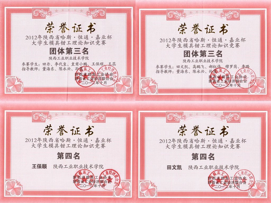 11月7日,2012年“哈斯·恒通·嘉业”杯陕西省大学生模具钳工理论知识大赛成绩公布,来自陕西省5所大专院校职校的40名学生参加了此次大赛。我院材料工程学院模具设计与制造专业学生组队参赛,并喜获2个团体三等奖、多个个人奖项。