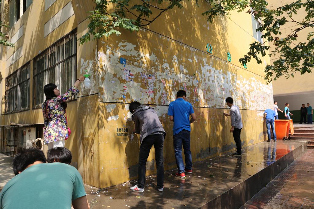 当天上午9时—12时,近百名同学参加了“我爱我家 清洁校园”文明大行动活动,在辅导员老师的带领下,学生们用铲子、刷子、钢丝球、抹布等多种工具对各种小广告进行了清理,同学们即使举得胳膊酸痛,站到腿发麻,衣服上沾满了脏东西,却没有一个人抱怨,看着清理后干净的墙壁和整洁校园,他们疲惫的脸上流露出自豪和满足感。