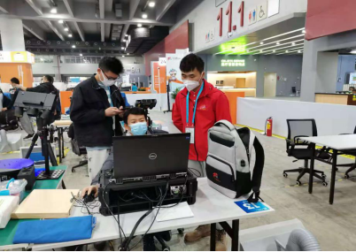 图1 选手刘哲(右一)在熟悉场地时虚心的向设备厂家技术人员请教
