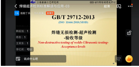 经过前期与全国大学生无损检测(超声波)技能大赛组委会老师沟通,由上海船舶工艺研究所丁兵老师组织了一次GB/T11345-2013《焊缝无损检测超声检测技术、检测等级和评定》、GB/T29712-2013《焊缝无损检测超声检测验收等级》两个标准及对接焊缝超声波检测实际操作线上培训,理化测试与质检技术专业李红莉老师、张保林老师、弋楠老师参加了此次培训,5月21日上午9:00~12:00丁老师讲了GB/T11345-2013标准及其应用,下午1:00到3:30丁老师讲了GB/T29712-2013标准,明确了国标中焊缝的验收方法;晚上6:00到7:30丁老师进行实际操作,讲解了两个标准在焊缝检测中的实际应用、技能大赛中操作过程的注意事项及评分标准等。丁老师的精彩讲解使我们对国家标准有了深刻认识,也期望我们在第六届大赛中能取得优异成绩。