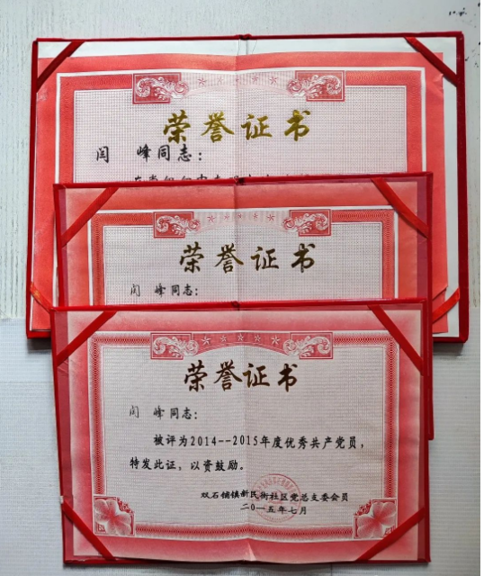 看着同学们来到家中拜访,闫峰爷爷颠簸的走进卧室,拿出了自己曾荣获劳模、优秀党员的荣誉证书和纪念章。告诉实践团成员:“这是我1997年获得的优秀党员,这是我的党员证书,这是.......。”老人已经行动迟缓,但是有一种信念根植心底,指引着他不畏困难,如一盏明灯,照明前方。