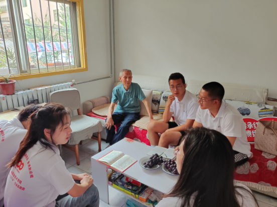 实践团成员们顶着烈日,在双石铺镇新民街社区党群工作人员的带领下,前往闫峰爷爷的家中。因为社区提前通知的原因,我们实践团到的时候,闫峰爷爷已在家门口的马扎上等候多时,实践团成员将爷爷扶进屋内,促膝长谈起来。