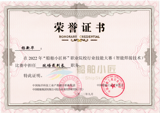 9月26至28日,由中国海洋科技工业产教融合职教集团、中国船舶工业行业协会主办的首届“船舶小匠杯”职业院校行业技能大赛智能焊接技术赛项在武汉船舶职业技术学院成功举行,我院教师杨新华应邀担任了此赛项的现场裁判长。