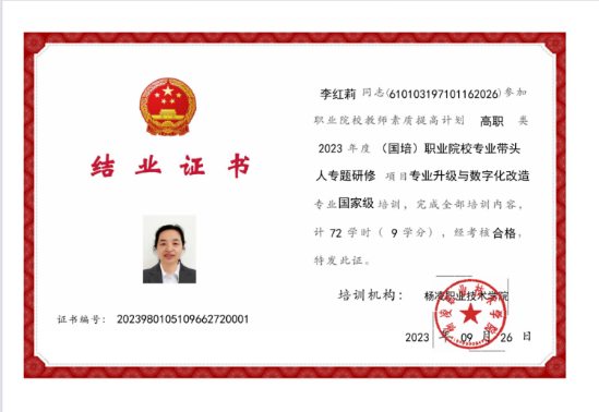 2023年10月8日至17日,我院教师李红莉参加了由杨凌职院主办的陕西省2023年度职业院校教师素质提升计划国培目--专业升级与数字化改造项目专题培训,陕西省20多所高职院校的骨干教师、专业带头人、教研室主任等40余位老师参加了此次培训,通过培训及学员间交流,了解到专业升级和数字化改造是当今社会中不可避免的趋势,也学习到其他学员在教学中的一些成功的教学案例。