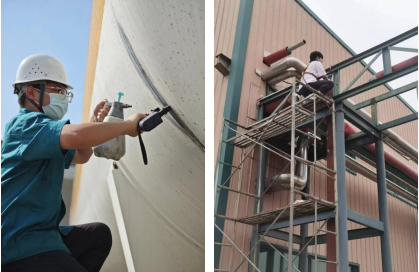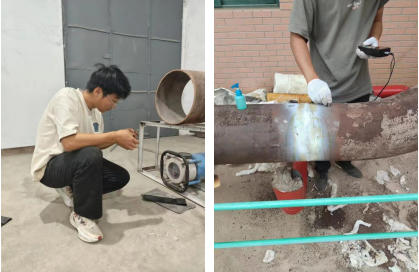 图1学生吕栋在进行锅筒焊缝磁粉检测 图2学生吕栋、李宇帆在进行管线检测